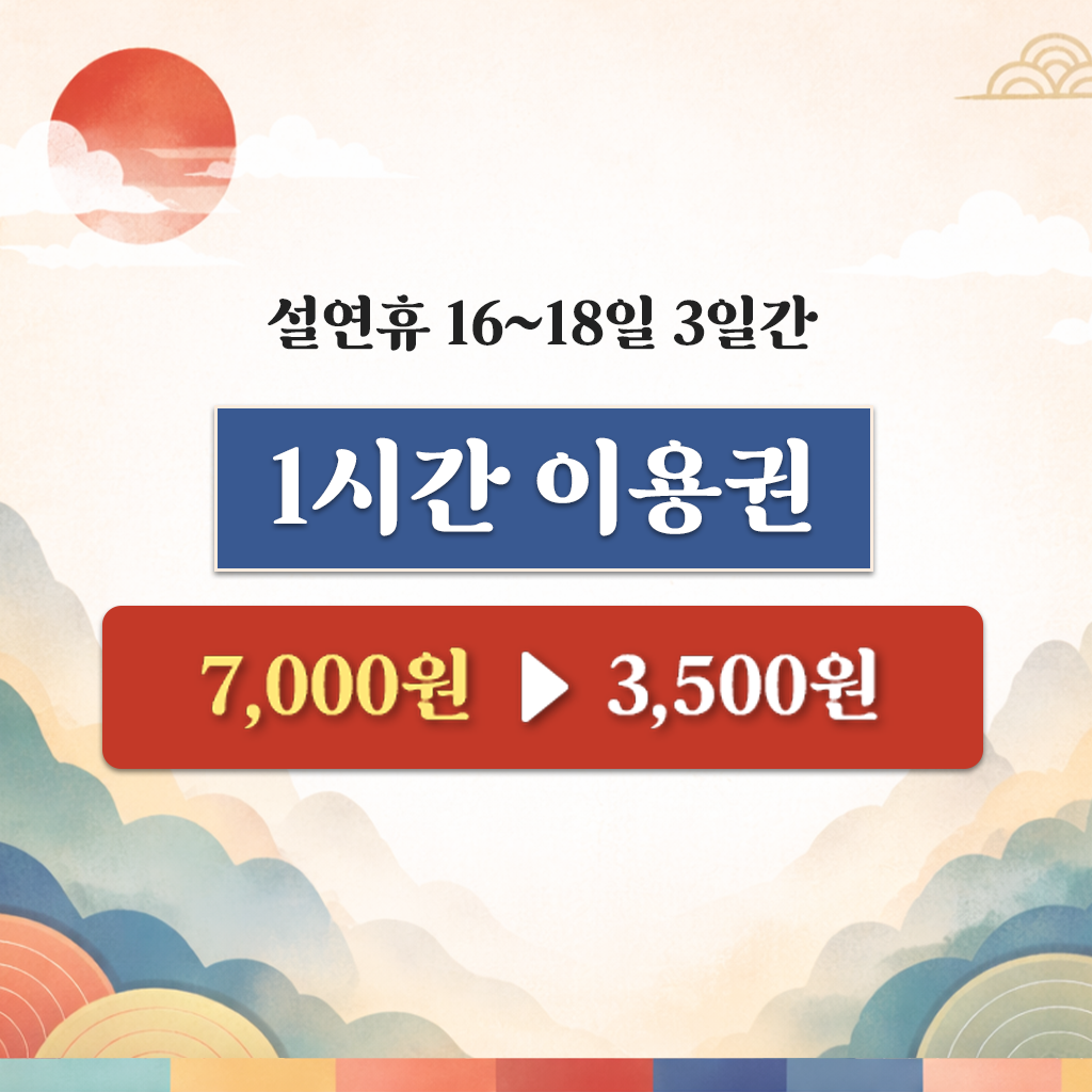설연휴 16-18일 3일간 1시간 이용권 7000원을 50% 할인하여 3500원으로 판매됩니다.